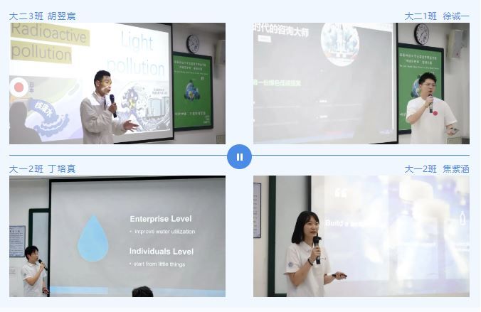 演讲比赛共吸引了9组选手参赛,他们分别来自不同班级。比赛中,选手们用流利的英语阐述了水污染、空气污染、光污染、土壤污染、放射性污染以及生物多样性缺失等环境问题。他们分别从政府、企业和个人三个维度提出了针对性解决方案。有的选手提出了通过政府加强立法监管,严厉打击非法排放污染物的企业;有的选手则呼吁企业积极采用清洁能源,推动绿色生产;还有的选手从个人角度出发,提出了减少塑料制品使用、倡导绿色出行等具体行动建议。