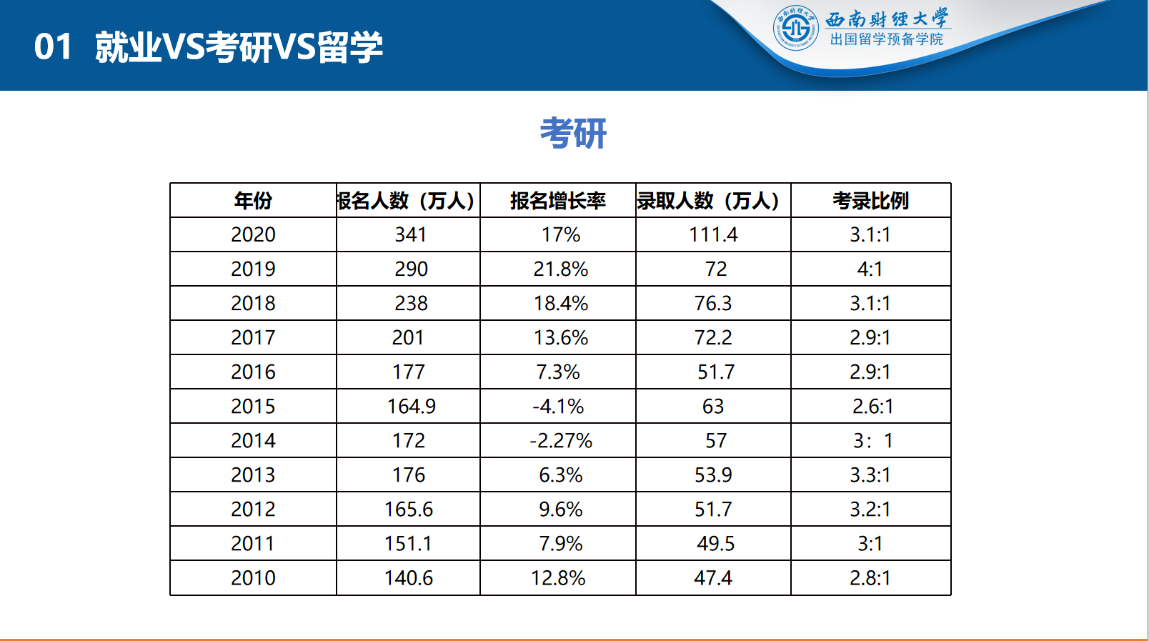 卢老师首先讲解了国内考研的趋势,近几年考研的报名人数均有增长,增长率约为17%-22%,可以预见2021年还会继续增加。考录比在3:1左右,因此考研形势依然严峻。在这样的趋势下,留学势必成为非常好的选择。