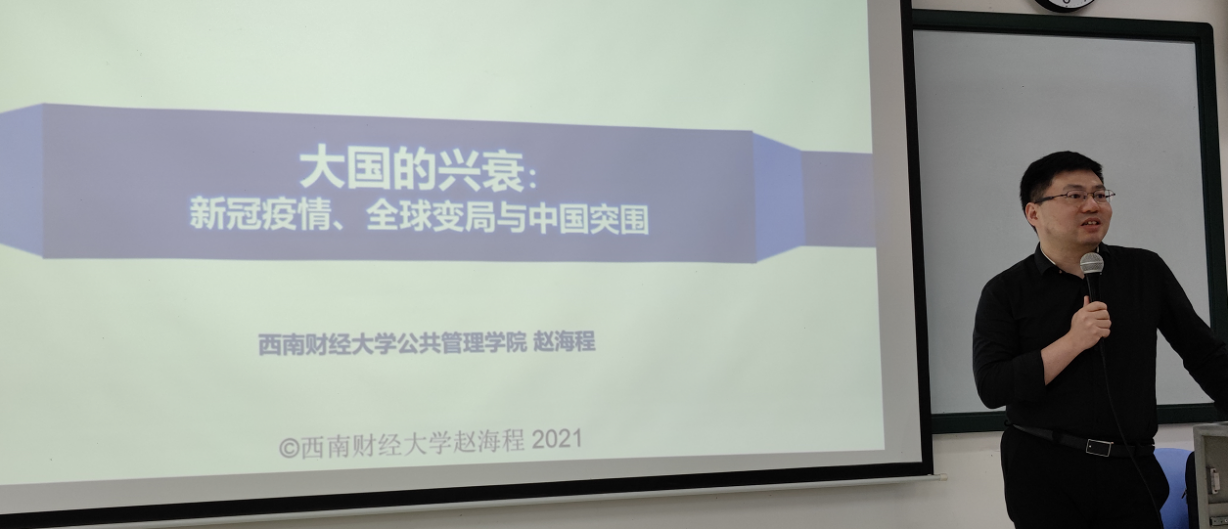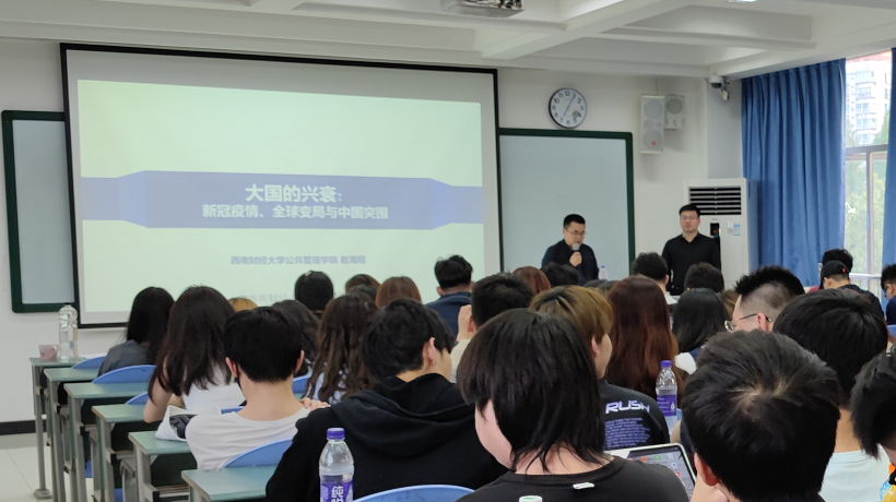 学生诠释了新时代中国外交。一是世纪疫情仍是最大的热点,疫情不是百年大变局的关键却是“药引子”,在疫情背景下,中国经济全面复苏,但世界疫情依然严峻;二是疫情下全球正在面临一场经济衰退,而中国已在去年后三个季度实现经济正增长;三是世界百年未有之大变局是东升西降,中升美降。赵老师引用丘吉尔的一句话“世界上没有永远的敌人,只有永远的利益”,解读中美关系这个当今世界最重要的双边关系,诠释新时代中国特色外交——“突围”;四是赵老师引用习近平总书记在看望参加全国政协十三届三次会议的经济界委员时的讲话:“坚定不移推动经济全球化朝着开放、包容、普惠、平衡、共赢的方向发展,推动建设开放型世界经济”,分析中国在外交上的经济博弈。最后,赵老师引用习近平总书记在庆祝中华人民共和国成立70周年大会上的一句讲话来结束讲座:“今天社会主义中国巍然屹立在世界东方,没有任何力量能够撼动我们伟大祖国的地位,没有任何力量能能够阻挡中国人民和中华民族的前进步伐。”