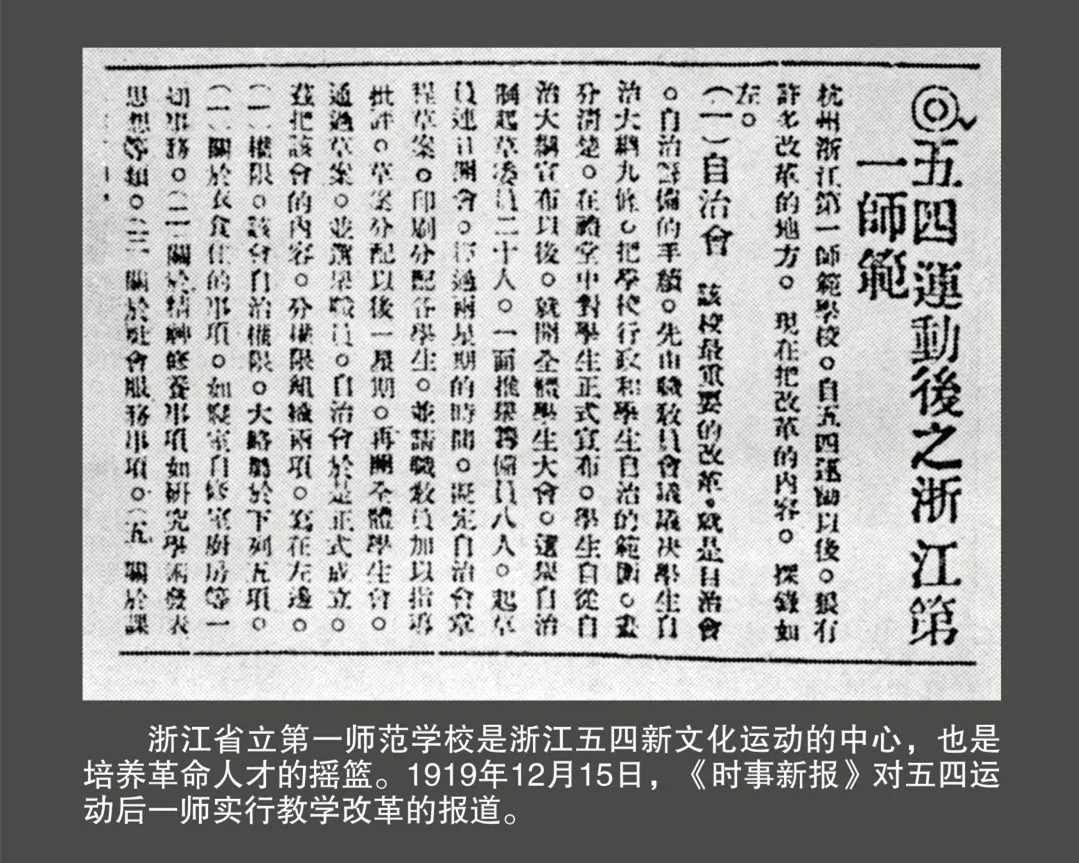 1919年,“五四”运动爆发并在中国大地迅猛发展,陈望道毅然回国到了杭州。受时任浙江第一师范学校校长经亨颐邀请,来到一师担任国文教员。一上任,陈望道为学生上的第一课就是鲁迅的白话文《狂人日记》。他和夏丏尊、刘大白、李次九等老师积极开展反帝反封建的新文化运动,在教学改革中提倡白话文,使一师师生的思想得到了大解放,被称为一师“四大金刚”。但这样的进步努力却触怒了当时的浙江军政当局乃至远在北京的北洋政府,最终引发轰轰烈烈的“一师风潮”。