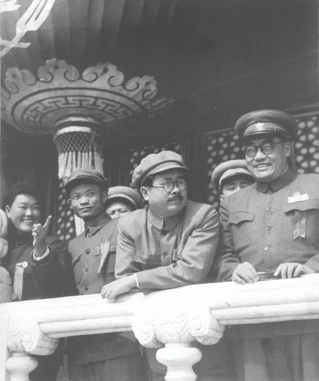 (任弼时(前排右二)登上天安门城楼参加国庆一周年庆典)